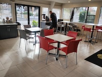 Rude employees in the am. Dirt under the beds. The rail on the second floor feels like it could fall off at any moment. Check in was fine. Sign in lobby says breakfast 730 am to 10. My adult son. Had to ring a bell to get in. Immediately asked what room number he was in. And what his name was. Be cause his first name is different than mine. They told him he couldn't eat. And that breakfast was at 8. We went down at 8 and had to wait to be buzzed in. They once again told my son he couldn't eat. I informed them that I paid for a room with two beds. And that the 2 of us were going to eat. And if they didn't like it they could call the cops. Breakfast was white bread only. Waffles. Only thing for the toast was grape jelly. No juices had Cheerios and frosted flakes. Coffee. No other choices.