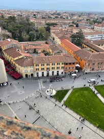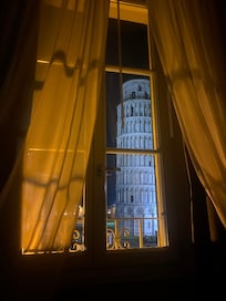 This is an amazing hotel with the Leaning Tower of Pisa literally outside the front door. The rooms were lovely and unusually but tastefully decorated with all the usual amenities and smelled beautiful. We booked a rear room with views of the courtyard and rooftops we were only there for one night on our way home from Florence so didn’t really want to pay extra for the tower view when it was outside the front door. We were able to wander around in the evening and experience the tower and cathedral without the crowds it was great. There’s a taxi stand within view of the hotel costing approximately €15 to the train station and airport it was so convenient for us. The staff were helpful and after checkout kept our bags so we could continue to enjoy the sites before our flight later in the day. You get a key card that opens the front door and your room so convenient. There didn’t appear to be any other hotels on this row it was a great find! 😀
