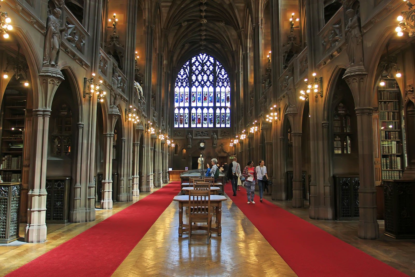 The John Rylands Library is a neo-Gothic, late-Victorian library that holds some of the largest special collections in the United Kingdom. Among the library’s prized pieces are a Gutenberg Bible, medieval illuminated manuscripts and one of the earliest surviving New Testament texts.